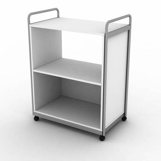 Carrinho Auxiliar/Multimídia móvel, confeccionado em MDP, alças laterais possibilitando o fácil manuseio e locomoção, rodízios com travas frontais, estrutura em aço com