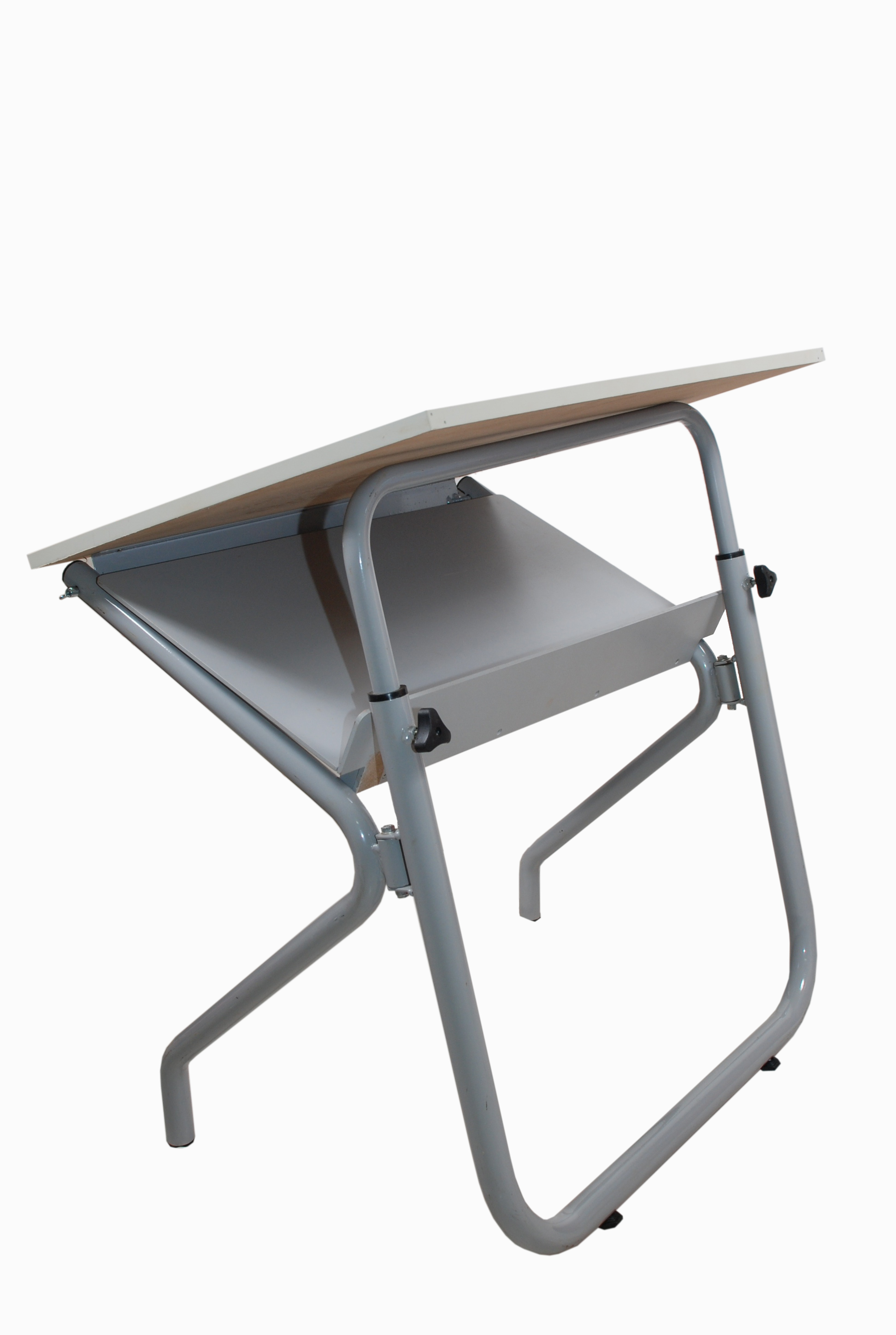 Cavalete para desenho com prancheta, fabricado em tubo de aço tubular, com acabamento epóxi na cor cinza, articulável, dobrável, tampo em MDP BP na cor branca ou cinza argila, impermeável, fácil de limpeza, bordos em PVC, colados pelo sistema hot-melt. Sistema de elevação através de manoplas, com inclinação de 0 a 45º, possibilita ao usuário executar trabalhos em banco alto Ref. 15011 Engeflex, cadeiras ou até mesmo em pé.