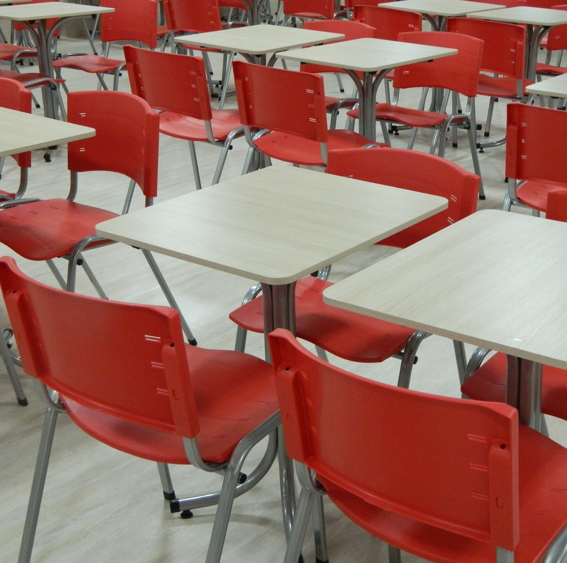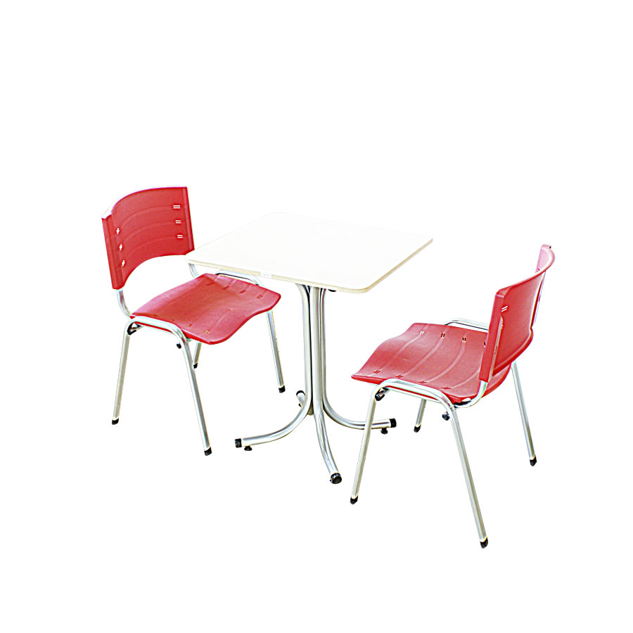 Fabricado em estrutura metálica, pintura epóxi, tampo em MDF 15mm, pés niveladores na mesa, cadeiras empilháveis, facilidade na limpeza e manuseio, ideal para pequenos espaços, acomoda 2 bandejas.